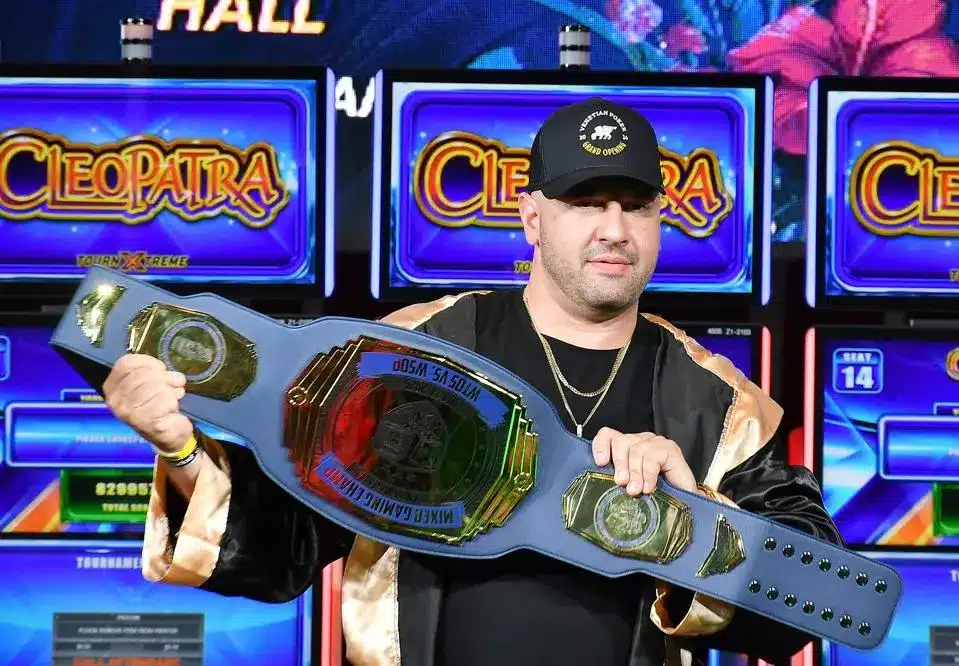 Michael “The Grinder” Mizrachi onstage after winning the head to head slot tournament duirng the 2025 myVIP World Tournament of Slots at The Atlantis Paradise Island Bahamas on October 22, 2025 in Nassau, Bahamas. Photo: Casey Flanigan/imageSPACE for playSTUDIOS, INC.
